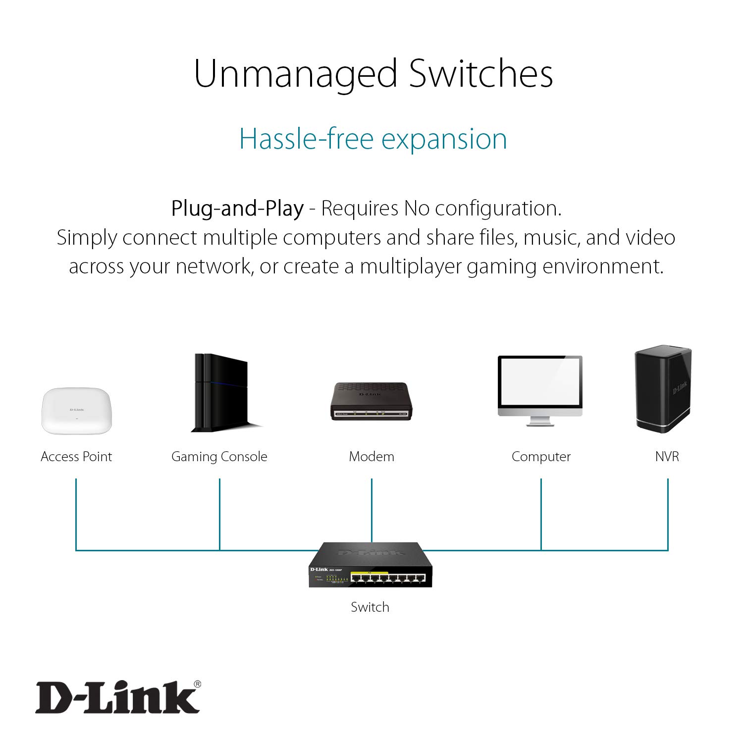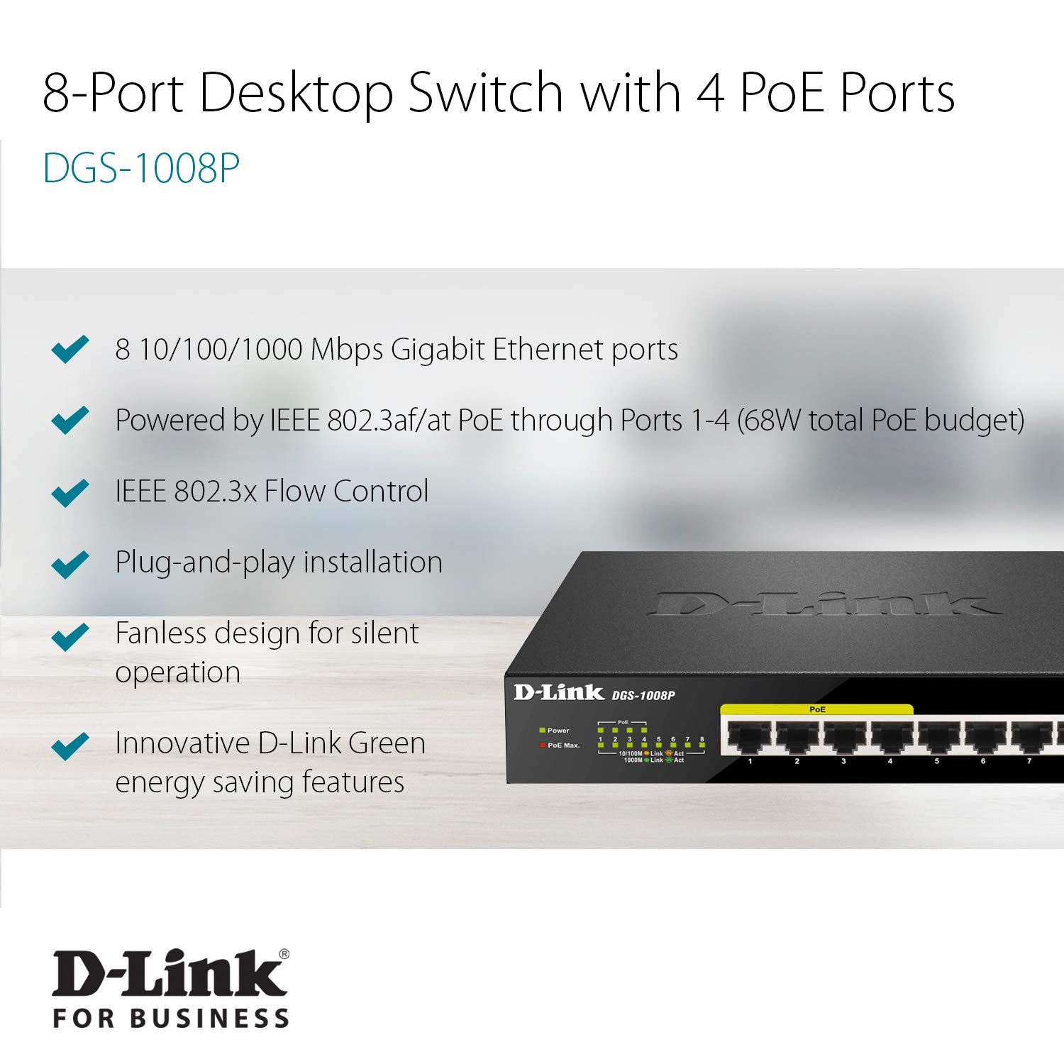 D-Link PoE Switch, 8 Port Ethernet Gigabit Unmanaged Desktop Switch with 4 PoE Ports 68W Budget (DGS-1008P),Black